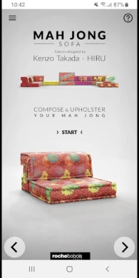 Roche Bobois Mah Jong 3D செயலி மூலம், Mah Jong சோபாவை (Roche Bobois Paris-இன் அடையாளச் சின்னம்) 3D-இல் அல்லது மேம்படுத்தப்பட்ட யதார்த்தத்தில் உங்கள் வீட்டில் எப்படி இருக்கும் என உருவாக்கி, தனிப்பயனாக்கி, காட்சிப்படுத்துங்கள்.